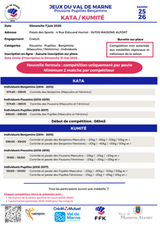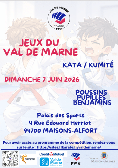 CDK94 Jeux du Val de Marne COMBAT Poussins Pupilles Benjamins Date Dim. 7 Juin 2026 Lieu Palais des Sports4 RUE EDOUARD HERRIOT 94700 MAISONS-ALFORT 👆 Cliquer sur l'image pour visualiser l'affiche et le programme