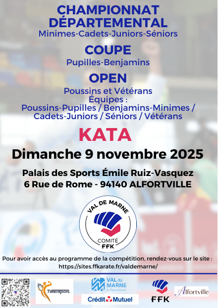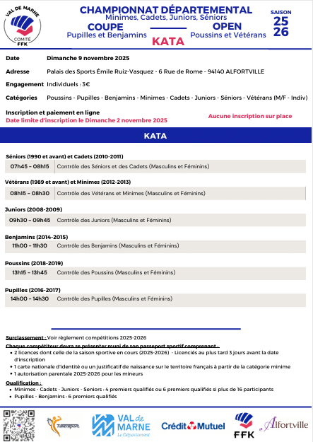 CDK94 Kata : Championnat Minimes à Seniors / Open Vétérans Date Dim. 9 Novembre 2025 Lieu ALFORTVILLE 👉 Cliquer sur l’image