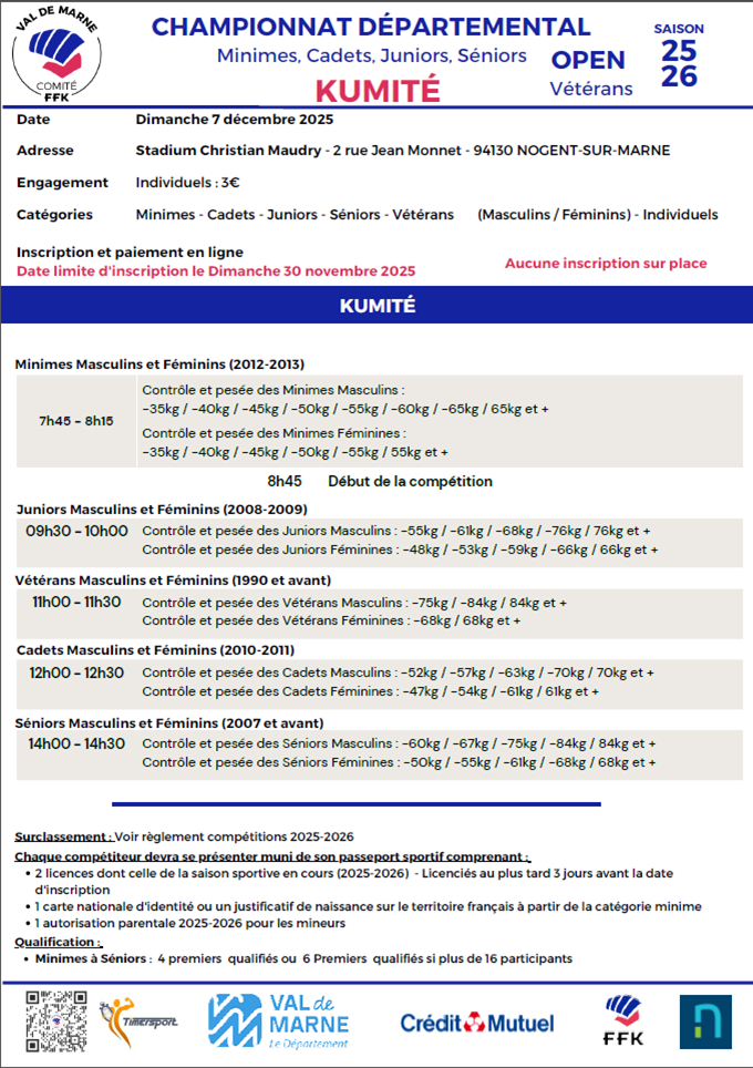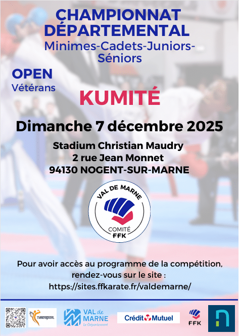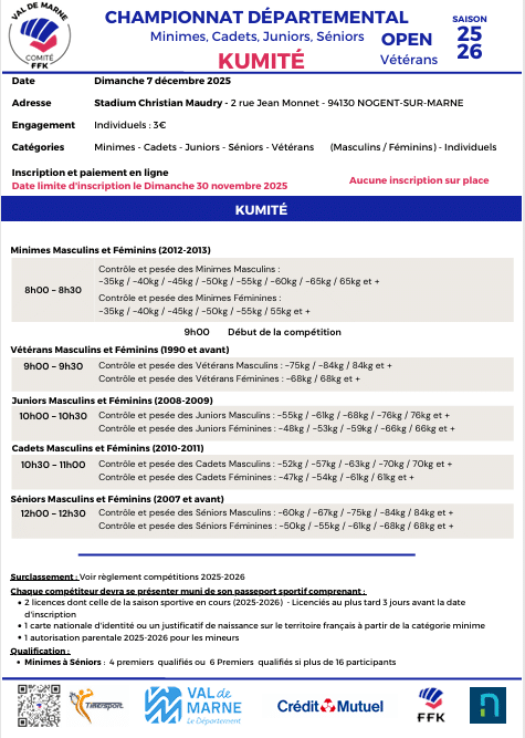 CDK94 Combat : Championnat Minimes à Seniors – Open Vétérans Date Dim. 7 Décembre 2025 Lieu Stadium Christian Maudry - NOGENT-SUR-MARNE (94)2 RUE JEAN MONNET 94130 NOGENT-SUR-MARNE 👉 Cliquer sur l’image