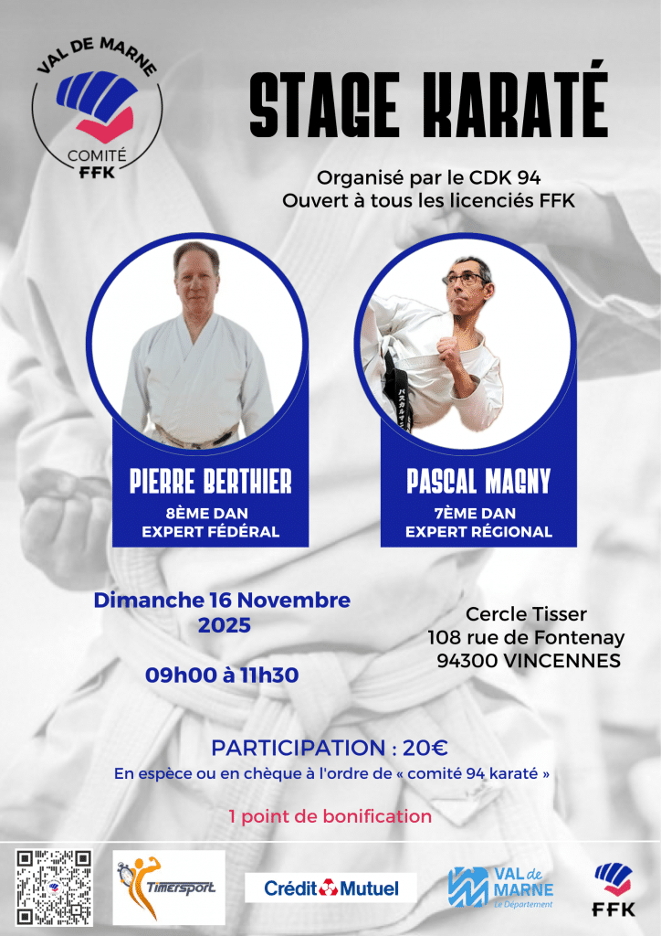 Stage départemental : Pierre BERTHIER (8ème DAN – Expert Fédéral) et Pascal MAGNY (7ème DAN – Expert Régional) Date Dim. 16 Novembre 2025 de 09h à 11h30 Lieu VINCENNES - Cercle Tissier108 Rue de Fontenay 94300 VINCENNES