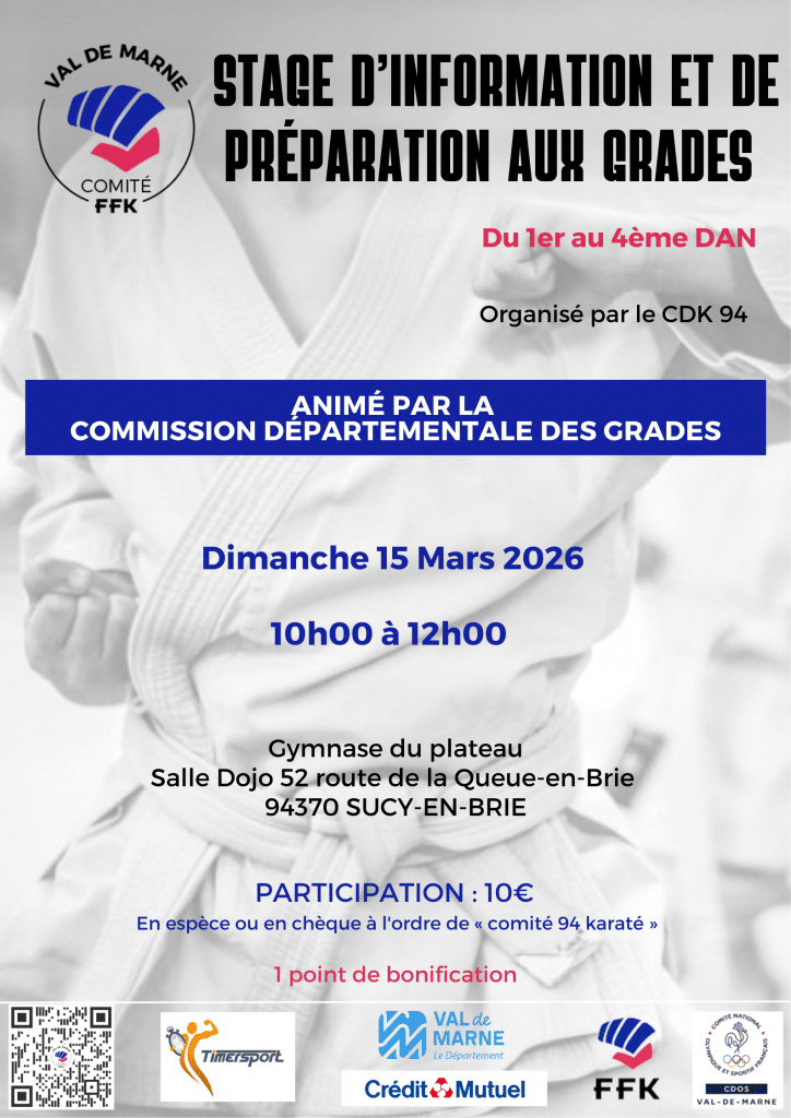 Stage d’information et de préparation aux grades de Karaté Date Dim. 15 Mars 2026 de 10h à 12h Lieu SUCY-EN-BRIE / Gymnase du plateauSalle Dojo 52 route de la Queue-en-Brie 94370 SUCY-EN-BRIE