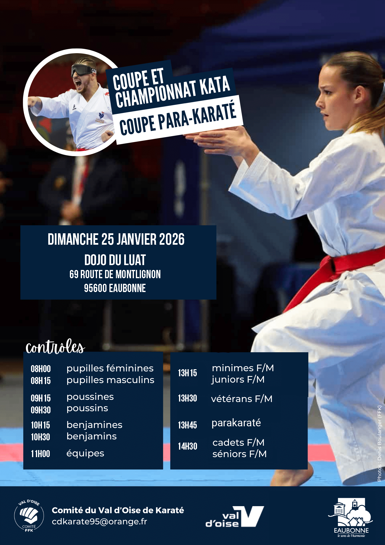 Coupe 95 Kata – Poussins à Benjamins Date Dim. 25 Janvier 2026 de 09h à 18h Lieu DOJO DU LUAT - EAUBONNE69 route de Montlignon 95600 Eaubonne