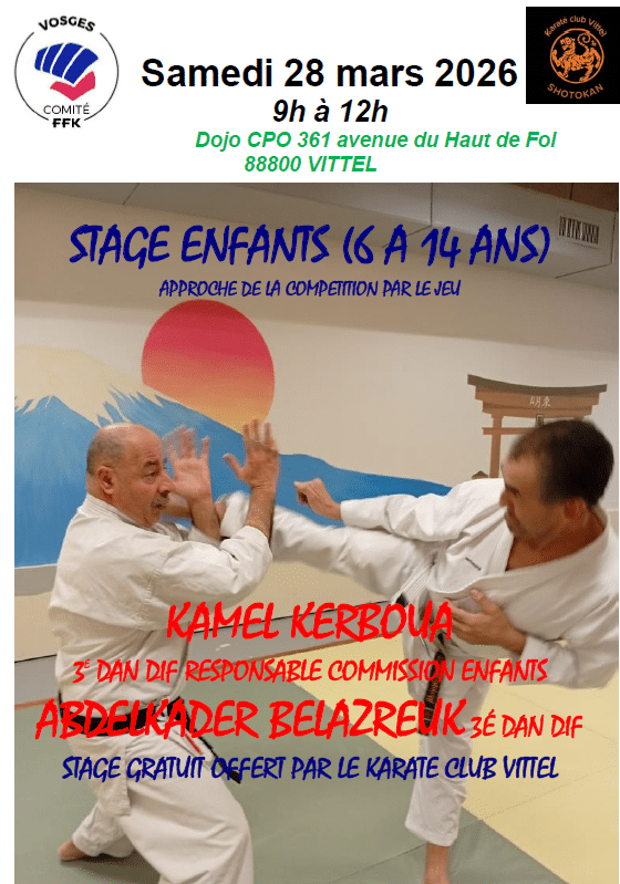 STAGE ENFANTS CPO Vittel Date Sam. 28 Mars 2026 de 09h à 12h Lieu Salle des arts martiaux CPO avenue du haut de Foll Vittel STAGE ENFANTS CPO Vittel, 9h a 12h Samedi 28 Mars 2026