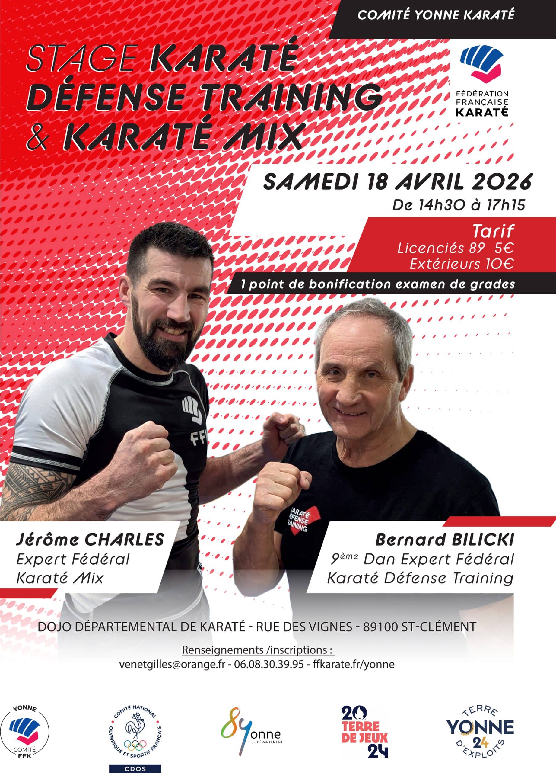 STAGE KARATE-DEFENSE / KARATE-MIX Date Sam. 18 Avril 2026 de 14h30 à 17h15 Lieu Dojo Départemental Saint-Clément